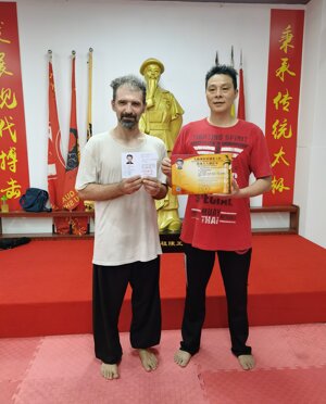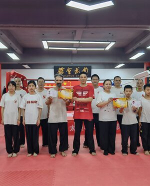 Shifu Liu Wu rappresentante della 12esima generazione dei Maestri di Taiji stile Chen consegna al Maestro Enrico Randi il certificato di suo discepolo rendendolo di fatto rappresentante della 13esima generazione nella sua palestra di Huadu (Guangzhou) alla presenza degli altri discepoli.