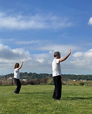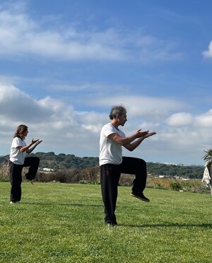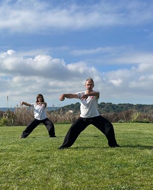 Immagini di una dimostrazione della forma "cavalcare il drago" del maestro Enrico Randi e della sua discepola Giovanna Petrucci fatta a Conil della frontera in Andalusia, Spagna