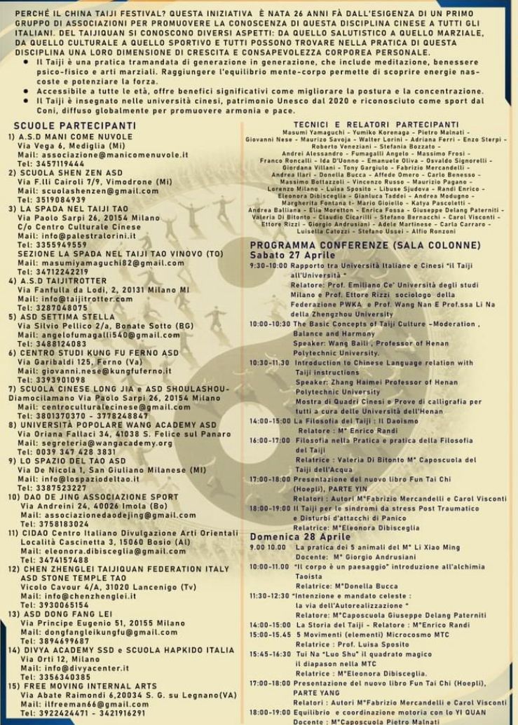 Una lista di 15 associazioni italiane per lo studio e la diffusione del Taiji parteciperanno all'evento portando le loro conoscenze e contribuendo all'arricchimento collettivo. Il Maestro Enrico Randi terrà due conferenze: