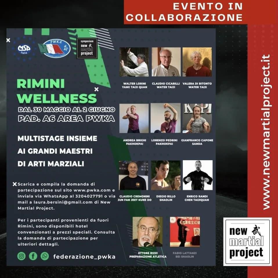 nei giorni Venerdì 31 maggio, Sabato 1 giugno e Domenica 2 giugno l'associazione sarà presente alla fiera del wellness di Rimini dove verranno fatte lezioni gratuite per i presenti. Le lezioni riguarderanno la forza principale del Taiji che è la forza di avvolgimento della seta con le sue molteplici applicazioni. Saranno presenti altri Maestri di altre arti marziali per completare il quadro.