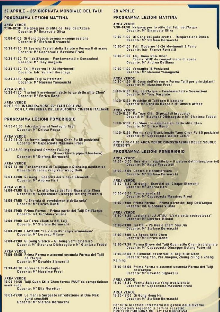 Tutte la numerose associazioni intervenute offriranno tecnici che faranno lezioni gratuite collettive a vantaggio di tutti i presenti. Il Maestro Enrico Randi terrà ben 4 lezioni: 27-4 ore 10:30 - 11:30 i primi 5 movimenti delle forme stile Chen; ore 16:00-17:00 l'energia di avvolgimento della seta. 28-4 ore ore 11:30 Tui Shou: le applicazioni dello stile Chen; ore 16:00-17:00 la spada stile Chen